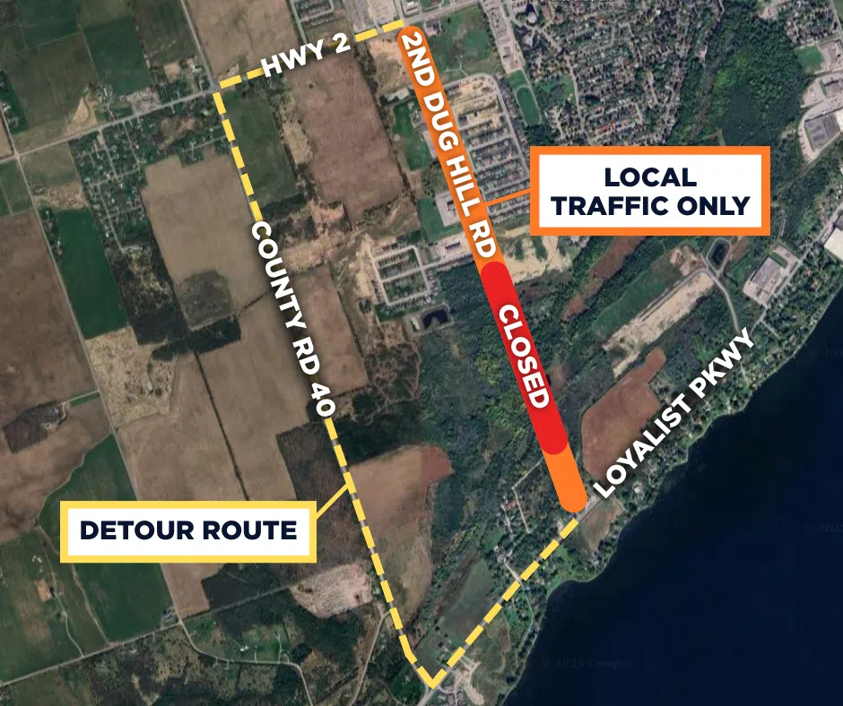 Southbound traffic is now being detoured west onto Highway 2, south onto County Road 40, and east onto Loyalist Parkway. Northbound traffic is being sent west onto Loyalist Parkway, north onto County Road 40, and east onto Highway 2.